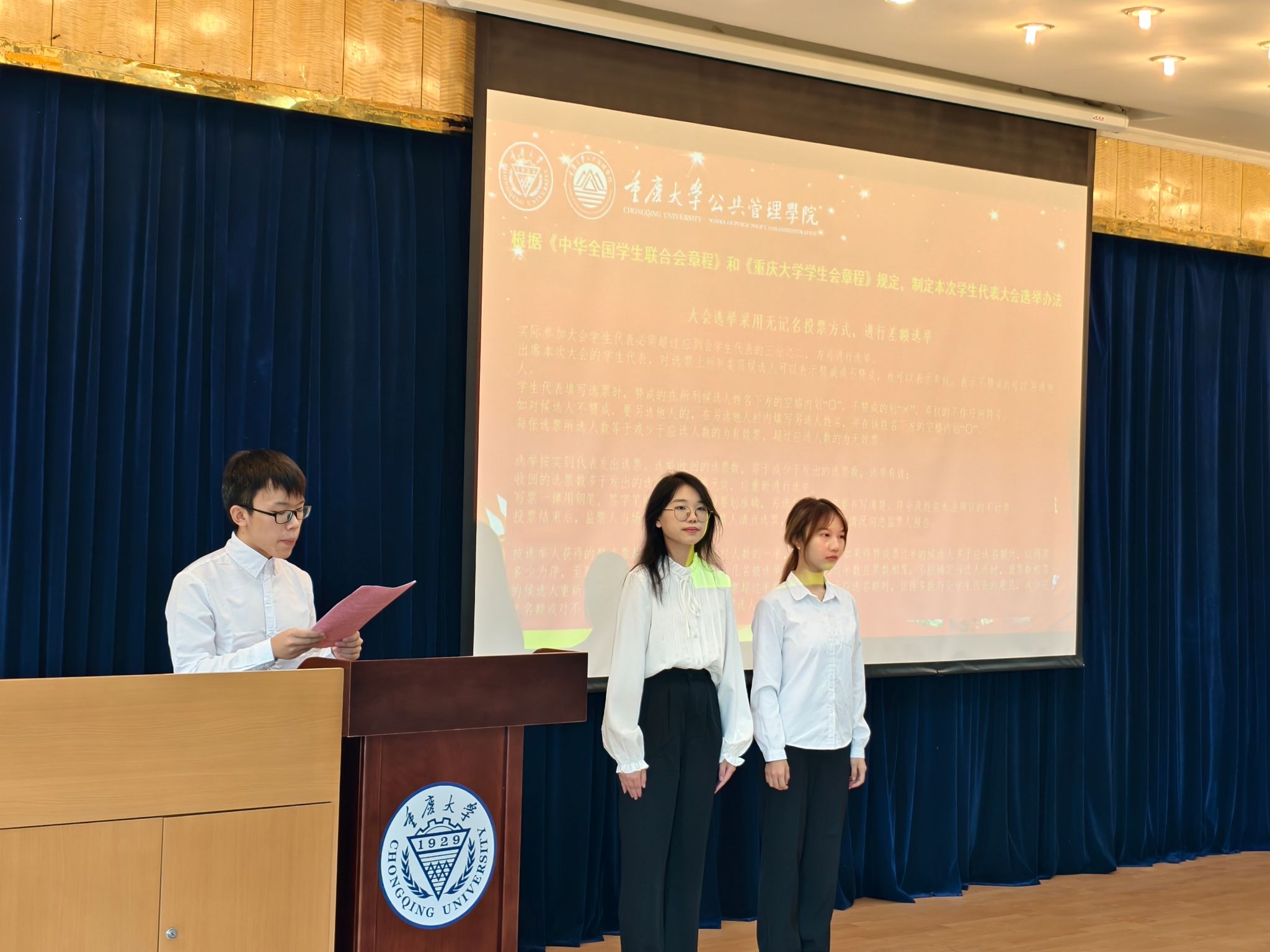 本科生学生会主席彭宇韩主持。会议伊始,全体参会人员肃立高唱中华人民共和国国歌,大会在庄严的歌声中正式开幕。