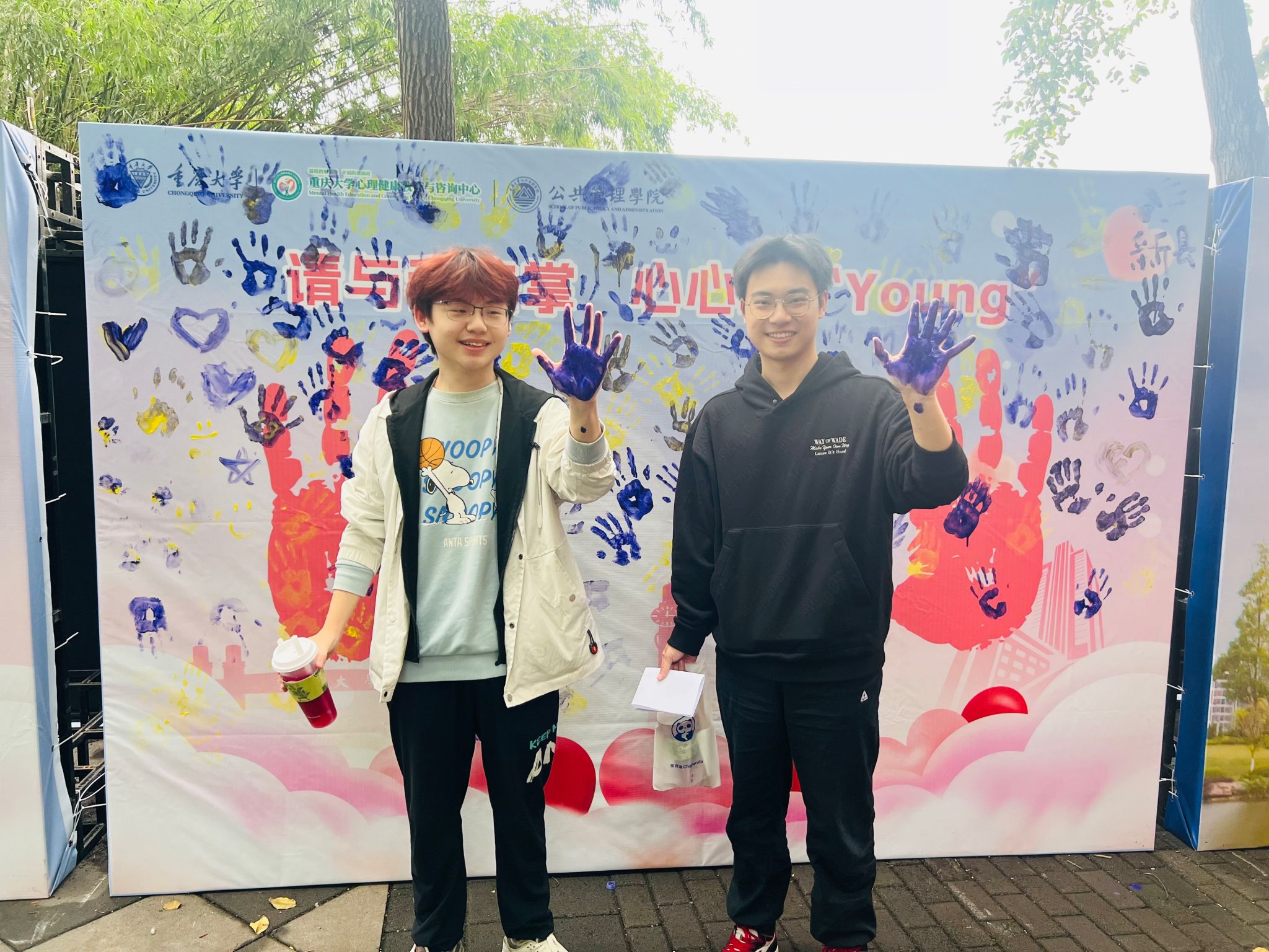 “请与我击掌,心心相‘Young’!”环节创意十足。现场设置手掌涂鸦墙,同学们用多彩颜料印下掌印,以“隔空击掌”的形式直观传递积极情绪与美好祝愿。