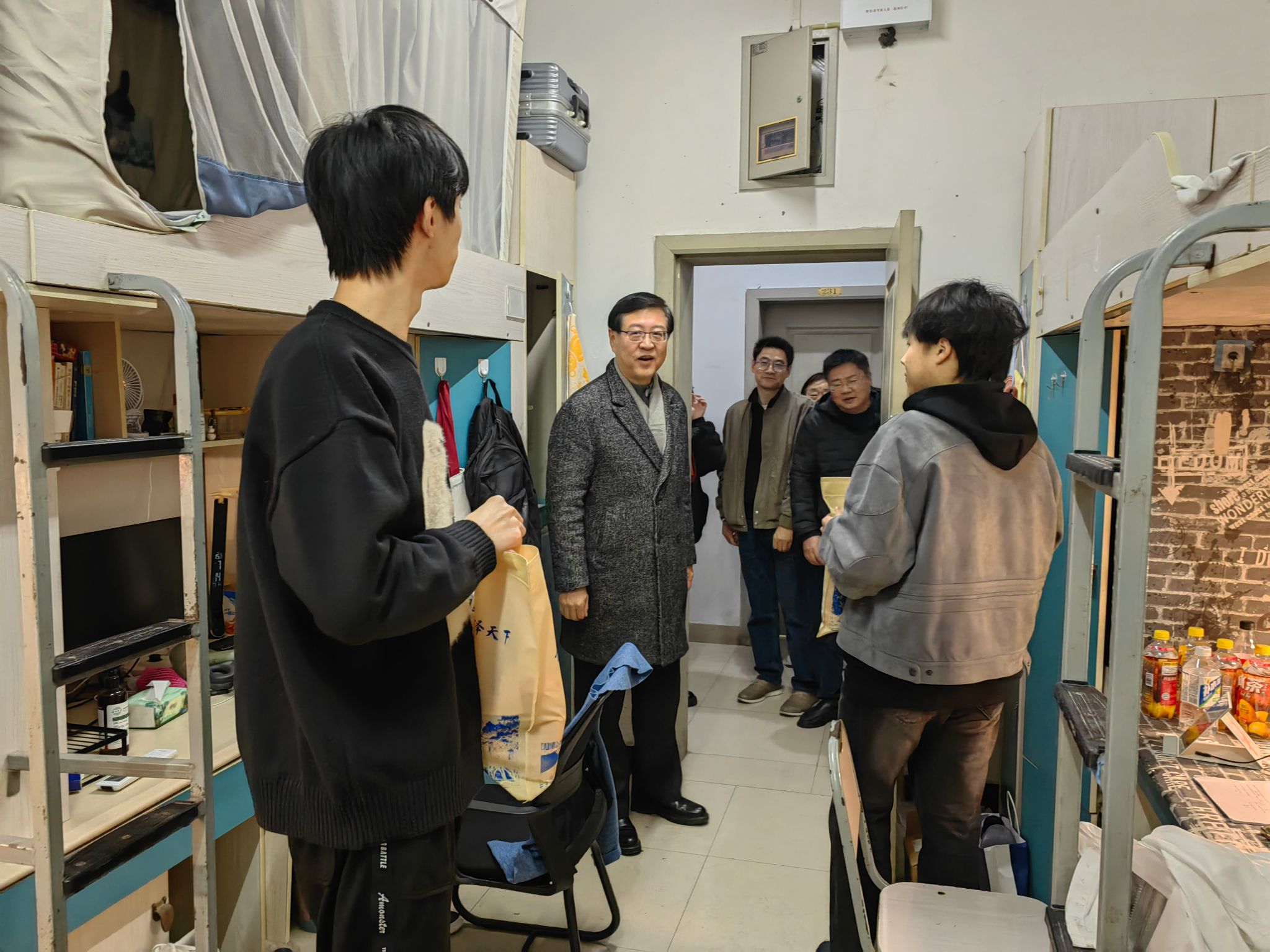 领导和老师们先后前往学生宿舍五舍和八舍对同学们进行了亲切的关怀和慰问。陈东书记鼓励同学们放平心态,轻松应考,面对压力要学会自我调节,需要时寻找老师和同学的帮助,无码直播