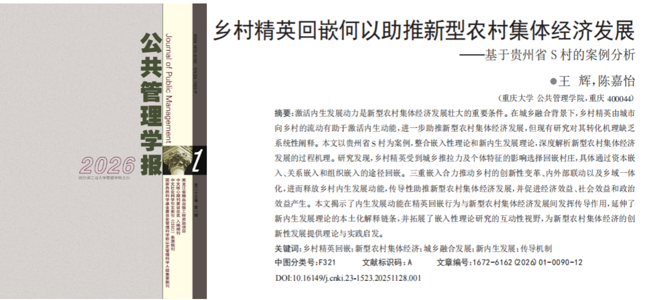 王辉教授作为第一作者的研究成果《乡村精英回嵌何以助推新型农村集体经济发展——基于贵州省 S 村的案例分析》在公共管理高水平中文期刊《公共管理学报》(2026年第1期)上无码直播