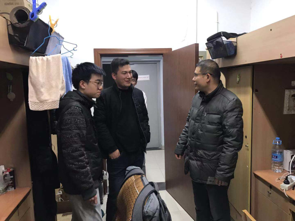 党委副书记袁晓浩和各年级辅导员走进学生宿舍开展走访检查。在检查宿舍环境卫生、学风氛围之外,重点对存在的安全隐患进行了排查,要求同学们务必提高安全意识和防范能力。期间,袁晓浩还就近期学习、生活情况和同学们亲切交流,针对刚刚结束考研或正在求职就业的毕业年级同学,提醒他们放平心态、保持自信,做好下一阶段准备;针对期末考试密集的其他年级同学,要端正学习态度,提高复习效率,积极诚信应考,同时也注意劳逸结合、缓解压力。他要求各年级辅导员随时关注学生思想动态和生活情况,及时给予必要的关怀和帮助,切实做到防患未然。