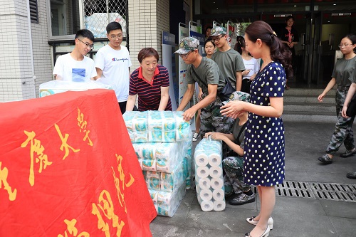 党委书记张玲、学办主任兼18、19级辅导员王丽娟、辅导员助理谢镇江于虎溪校区松园4栋楼下对19级军训的新生进行了慰问与深入交流。18级班团委的同学们到场协助分发慰问品。