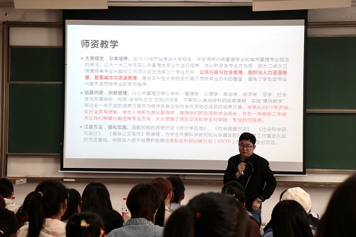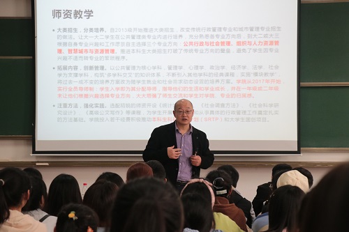 教学、师资教学升学就业等多个方面为大家介绍各自所在专业的具体信息。接着,吴光东老师、刘晓民老师、陈培峰老师为大家介绍了各系教授、副教授及讲师,使同学们对公共管理类专业有了更加深入的了解。
