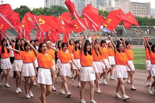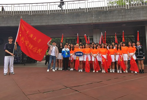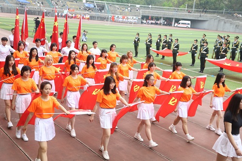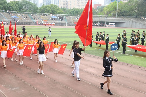 的方阵依次入场,向大家展示着青春与热血的力量。公管代表队队员们身着象征着活力的橙色上衣,手持国旗党旗,一步步向主席台走来,在中国共产党建立100周年到来之际,以满腔热情与最诚挚的爱,为青春喝彩,为祖国献礼。