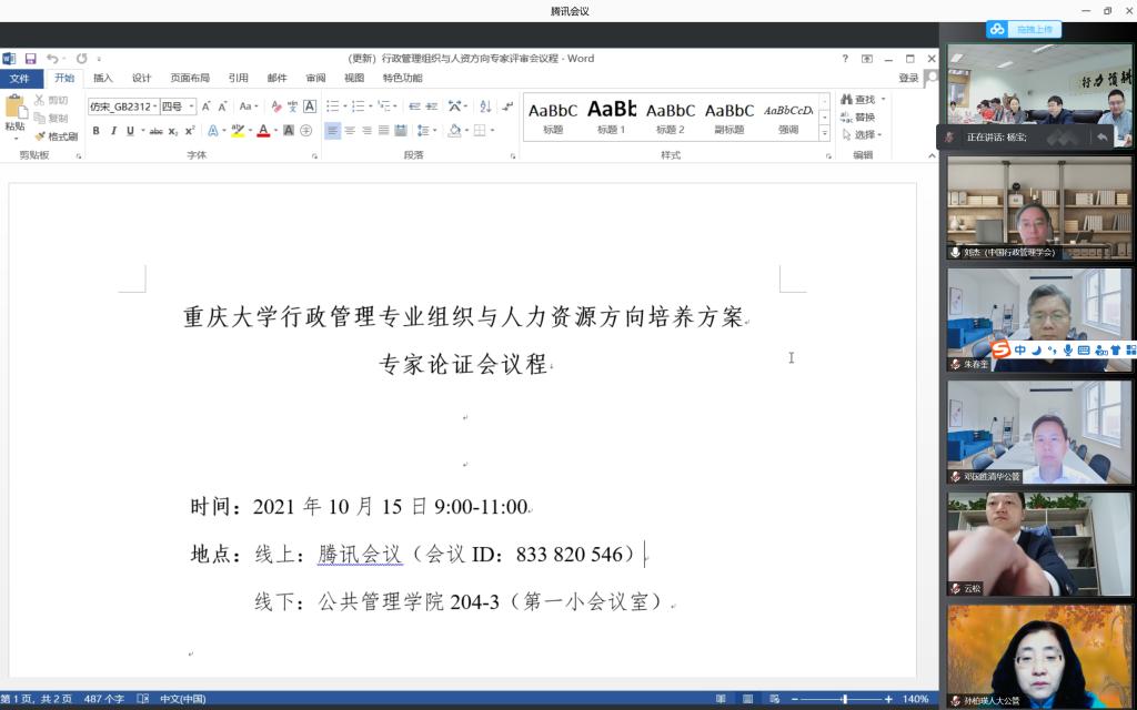 院长章文光教授为成员的八位专家对行政管理本科(政府与社会管理方向)专业培养方案进行了评审。专家们对培养方案修订的调研基础、总体框架表示认可,并对培养目标、课程设置、课程思路、教育模式等内容提出意见和建议,强调更进一步加强人才培养和行业需求、国家治理能力现代化的衔接,为党育人、为国育才,培养适应新场景的社会主义合格接班人。