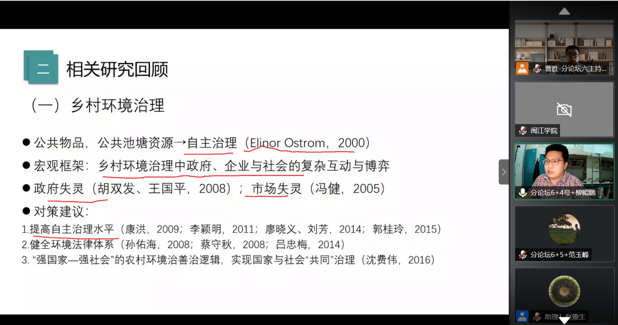 彭小兵教授指导下完成的《协同性治理:一种乡村环境治理模式及其内在机制》,柳鲲鹏同学分别从问题的提出、相关文献回顾、进入个案、理论建构、总结与讨论五个方面进行了报告。基于乡村振兴的战略背景,柳鲲鹏同学化用Ansell和Gash的协同治理分析框架,对重庆市Q镇B村的环境治理实践进行理论演绎,构建出以院坝会为议事机构(公共论坛),以村规民约为行事规范,以“组织动员机制”“利益协调机制”和“政府监督机制”为治理系统,政府、企业、村委会、村民等多主体角色明确、互动参与的合作架构。
