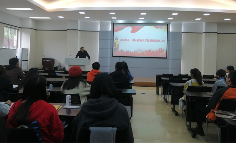 党委副书记、本科四支部书记袁晓浩为本科二支部、四支部党员讲“不忘初心、牢记使命”主题教育专题党课,结合当下形势,讲解共产党人的初心与使命。本科二支部书记、2016级辅导员徐柳老师以及本科二支部、四支部全体学生党员参加了会议。